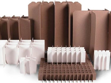 Chipboard partitions are used for delicate products and large castings, as well as any item subject to breakage or damage in shipment. Chipboard partitions cost less than corrugated. Chipboard can save 30% to 50% over corrugated, although corrugated partitions are also available. Awkward shapes are particularly suited to chipboard partitions. Partition air cells provide proper cushioning for delicate products.